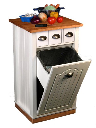 Finish:White Butcher Block Bin With Pantry Compact, mobile and efficient. A great addition to any kitchen. Solid hardwood cutting board top 3 handy drawers Holds a standard 10 gallon (41.25 qt.) size waste basket (not included) 3 pantry shelves and a paper towel holder in the rear Hidden casters behind real hardwood skirt offer smooth and easy mobility Beadboard panels Solid, thick legs Handles are nickel with a nice satin finish Constructed from durable, easy to clean, stain resistant, melamine laminated particle board Easy assembly required Made in the USAYou will not be disappointed with