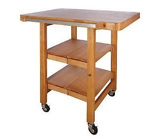 THIS IS NEW IN OPEN BOX!!! WE OPEN AND INSPECTED This folding island with rectangular butcher-block top gives you an impressive 5-square-feet of prep area, plus convenient stow space, instantly. If the missing ingredient in your cooking area is space, this cart completes your recipe for kitchen contentment.It's essential. At 36"H, this cart is just the right height for prepping meals, making coffee, decorating cookies with the kids, or even crafting--just pull up a stool. It also gives storage galore. The clever layout provides a towel/utensil bar, a rack for eight wine glasses below the tabletop, and two shelves--great for housing plates, wine bottles, appliances, serving utensils, you name it.Even better, it looks good. The cart is constructed of solid wood, so it's sturdy, substantial, and adds a handsome designer touch--choose the finish that best complements your decor. It makes an attractive serving station when you entertain, eliminating clutter on your dining table. Plus, it's equipped with locking caster wheels so you can move it where you need it most, then secure it into place. Because it's rectangular, you can use it as an island, tuck it into a corner, put it flush against the wall, or set it next to your counter. The versatile shape helps you make the most of your kitchen's layout.And for the times you need more floor space instead, the unit folds down and stows out of sight--something you can't say about permanent counters or islands!Parquet butcher-block-style top with 5-square-feet of work space Built-in stemware rack under tabletop Utility/towel bar Two bottom shelves Locking casters on wheels help secure cart in place Solid rubberwood construction Top not intended to be used as a cutting board Clean with mild soap No assembly required Cannot ship to Canada or P.O. boxes Approximate measurements: open 36"H x 32"W x 22-1/2"L; folded 35"H x 5-1/2"W x 22-1/2"L; 11-1/4" between shelves; weighs approximately 44 lbsYou will not be disappointed with Folding Island Rectangular Kitchen Cart w/Butcher Block Style Top